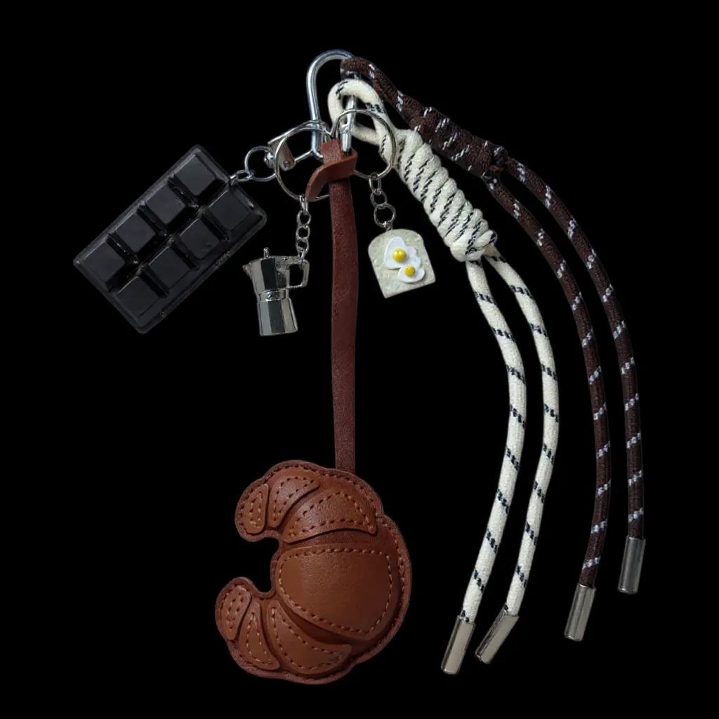 This keychain is a tribute to the little joys of life: a soft-textured croissant, mini moka pot, chocolate bar, and egg toast.