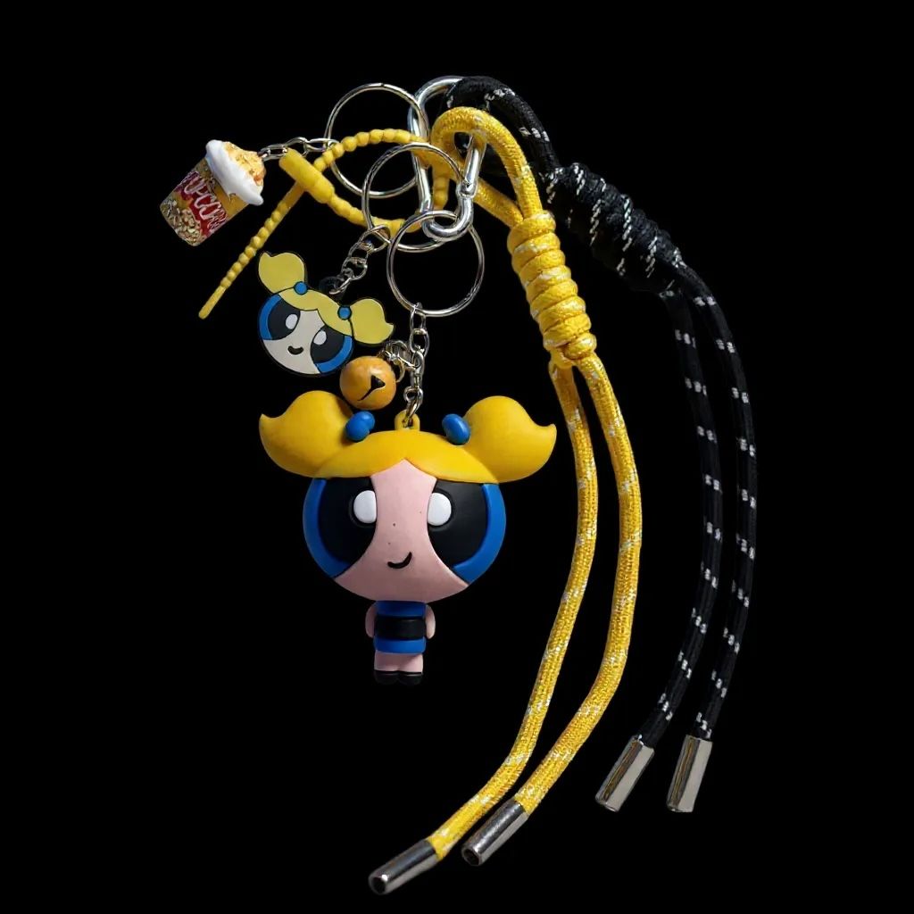 This keychain features a bold and adorable mini figure, paired with fun charms: a popcorn box, a smiley face, and vibrant yellow and black cords.
