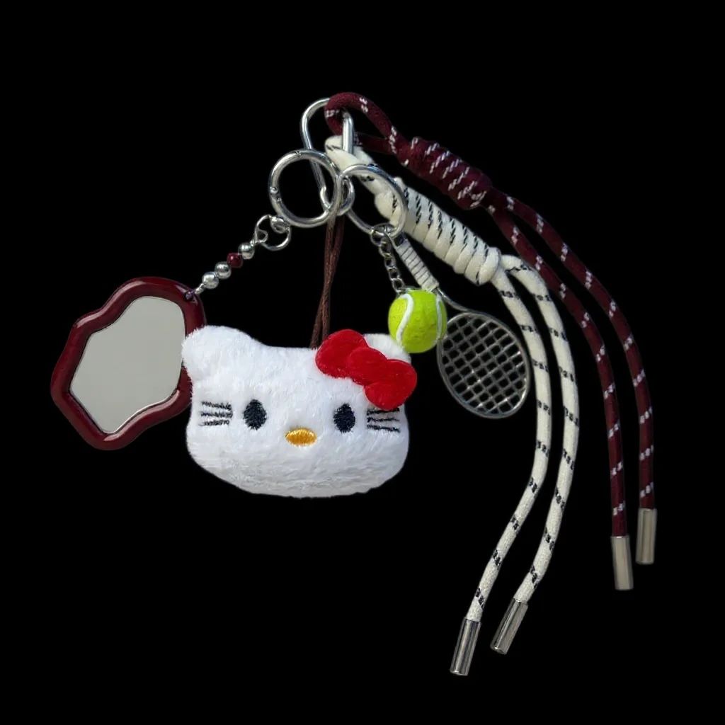 This keychain features a plush kitten face with a red bow, a tiny tennis racket, a mini ball, a vintage-style mirror, and cords in wine and beige tones.
